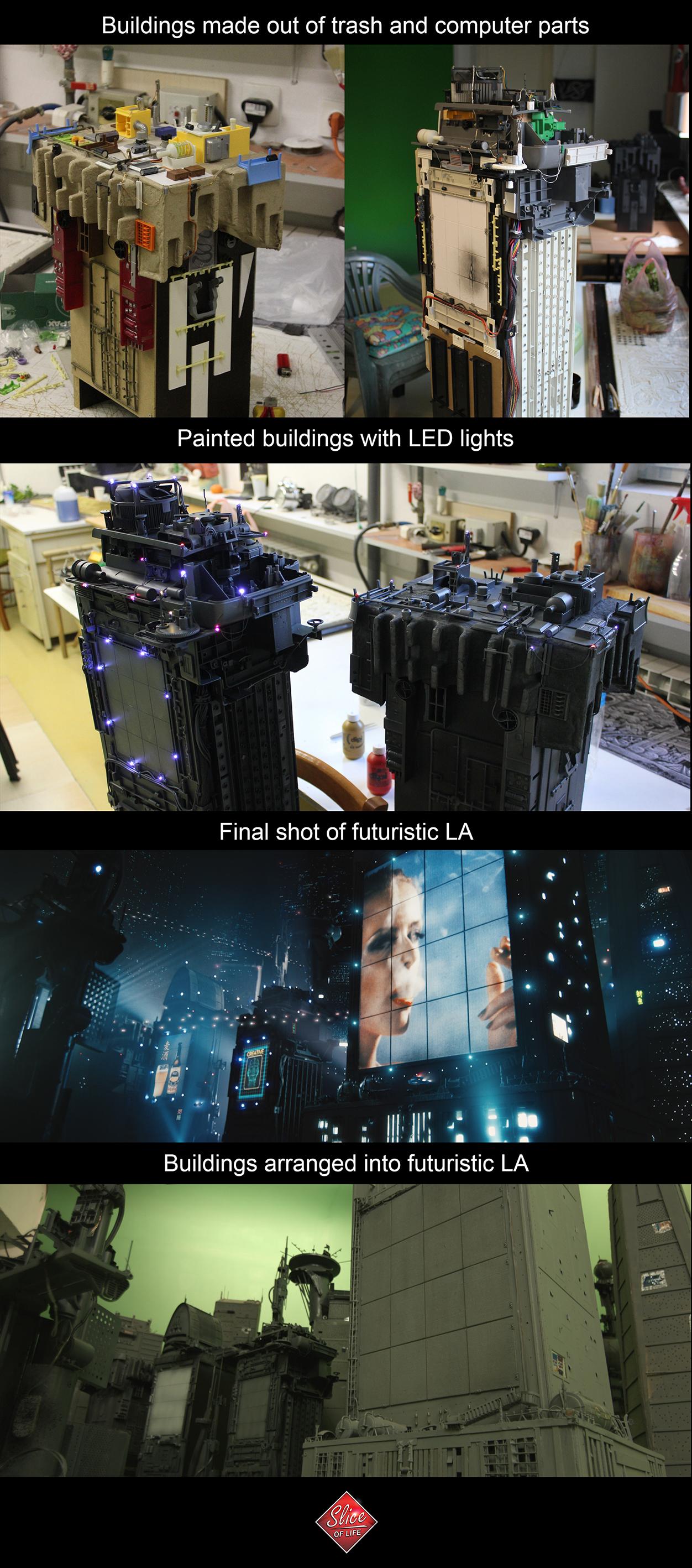 The whole film is made the old school way like the legendary Sci-Fi movies of the 80’s. Think miniatures, matte paintings, rear projections – check out the photo below to see how they did some of the cityscape.
