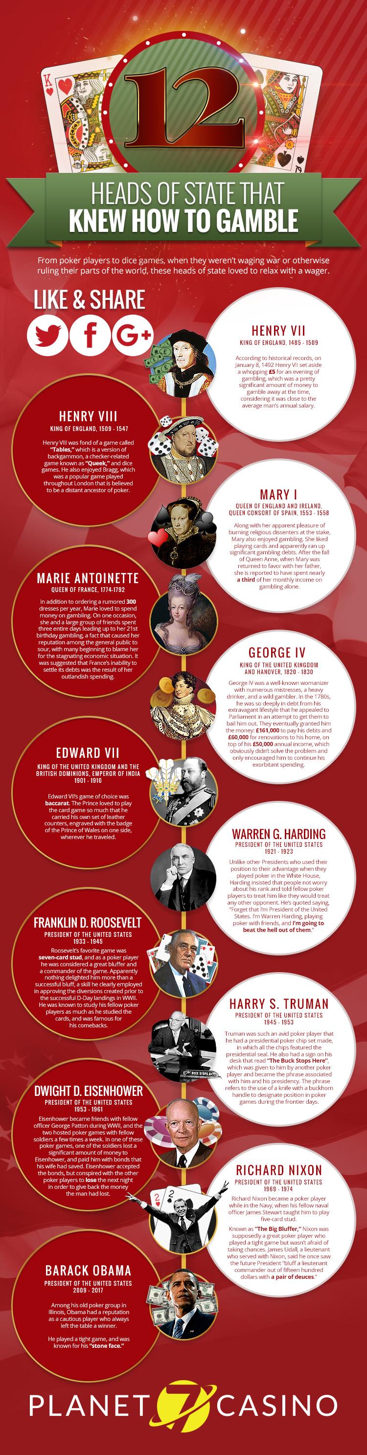 Want to learn more about historical heads of state who liked to live life to the full, and world leaders that gambled? Planet 7 Casino has put together a great infographic filled with tidbits you likely didn’t know about some of the most famous historical people ever.