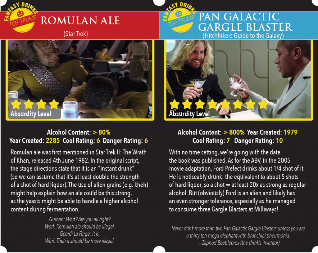 In an effort to bring a selection of these fictional beverages within the confines of reality, we decided to delve a little deeper into their stories, creating some fantastic Top Trump-esque cards for your enjoyment.