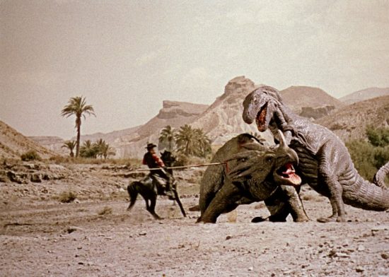 Cowpokes head into a mysterious Mexican valley to head ’em up and move ’em out. But they’re not looking for little dogies. They’re looking for great, big dinosaurs. James Franciscus stars in this thunderous adventure featuring amazing special effects by Ray Harryhausen (The Beast from 20,000 Fathoms, Clash of the Titans). Franciscus plays a Wild-West showman who leads his riding and roping crew into the title region where prehistoric giants still roam. Thanks to Harryhausen wizardry, fantastic creatures lunge, fight and rampage in scene after dazzling scene (including an awesome sequence where the cowboys rope Gwangi, a razor-toothed allosaurus). Saddle up and join the excitement.