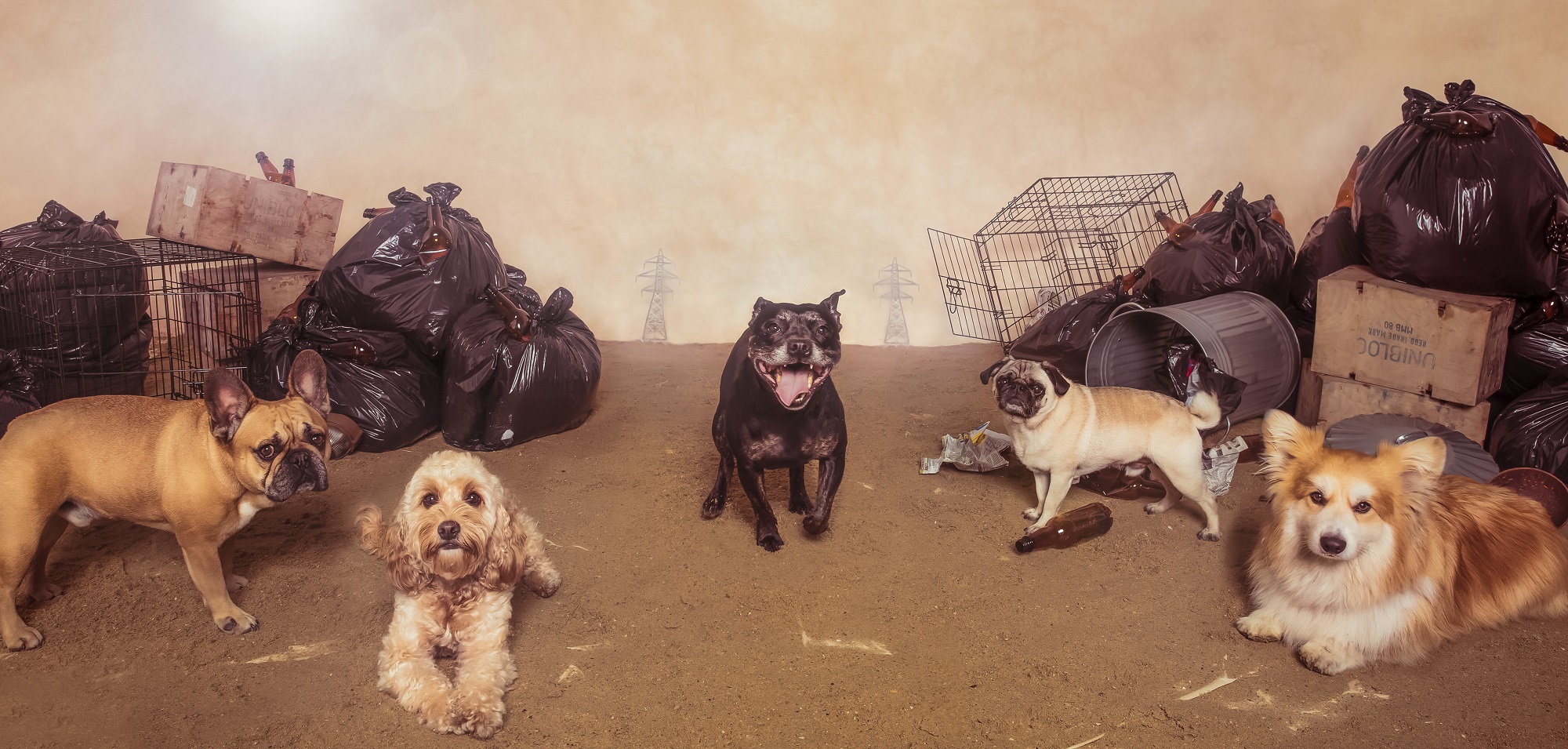 Photographer Linda Blacker herded celebrity dogs Marcel le Corgi, Cockapoo Marley, Doug the Therapy Pug and Steven the Frenchy to support Staffordshire Bull Terrier rescue dog, Emily, in an ISLE OF DOGS inspired photoshoot to help raise awareness of the thousands of dogs that are abandoned every year.