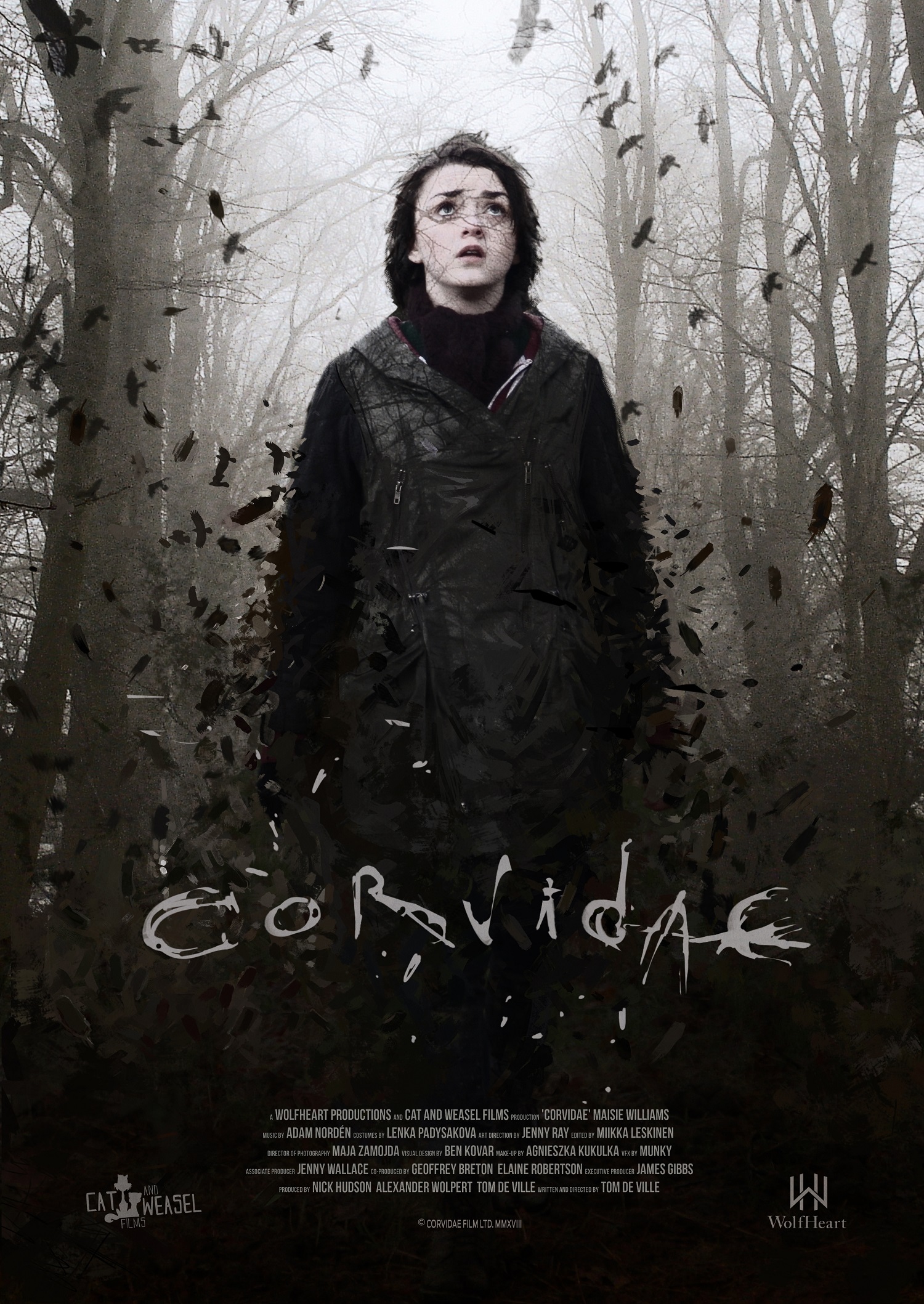 Cat and Weasel Films and Wolfheart Productions are pleased to announce that their latest short film Corvidae starring Maisie Williams (Game of Thrones, Doctor Who) will premiere this month in London at the annual FrightFest Film Festival on August 27th 2018.
