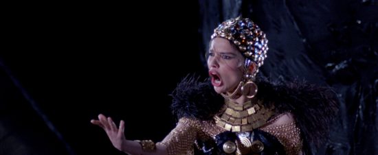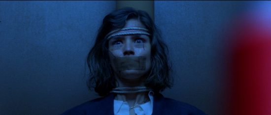 The film is replete with clever camera moves like these, or shots which go through the claustrophobia of a ventilation duct out into the vast, baroque space of the opera house interior and swings around the stage, creating not only some stunning visuals but also generating a disturbing sense of dislocation, of things being out of kilter, of someone or something watching, just out of sight. When not indulging in some skilfully mobile camera moves Argento also creates some more close-up, intimate moments of tension and horror, such as the killer’s point of view perspective (just those iconic Giallo killer’s leather gloves visible). And then there is that scene – many of you will know the one I mean, it has passed into horror movie history as an incredibly inventive, disturbing and iconic shots. Betty, tied up by the killer (again only glimpses of his leather gloves), but she is not the main target, rather she is the sadistic victim, restrained, needles taped to her cheeks below her eyes so she dare not blink, forcing her to watch as the killer waits for her boyfriend to enter and be slaughtered.