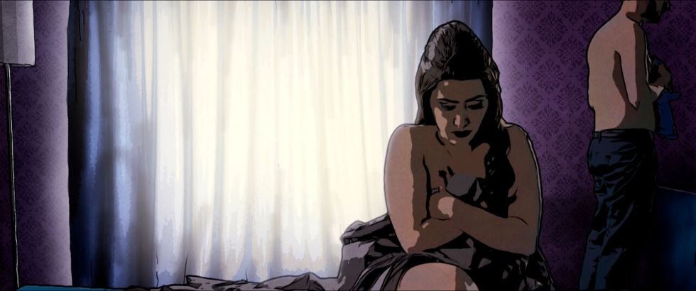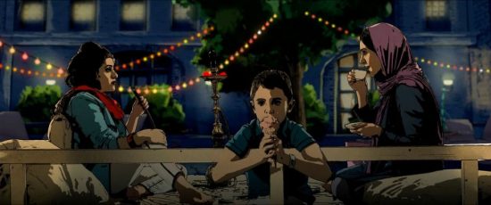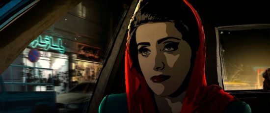 We start to learn those secret lives in the individual strands, which then cross lines with Pari’s story throughout the film, a little like Short Cuts, all of which is delivered with Rotoscoping animation over the live actors, giving the film a very interesting visual style, like Waltz With Bashir or A Scanner Darkly. This approach allows for some interesting visuals – Babak, attempting to take an intimate phone call on the train where you never know who may be listening (and happy to report you to the religious police), turns towards the window, and the camera moves outside the carriage to look in at him on the other side of the window, or Pari and Sara having an evening out eating in an open-air cafe in a beautiful, colourfully-lit square at night, or a view from the apartment over an animated, nocturnal cityscape of Tehran.