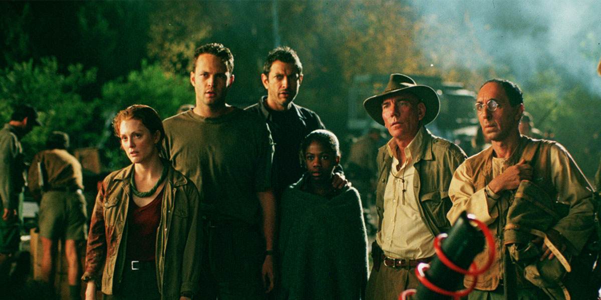 So following the discovery of dinosaurs on another island, neighbouring the Isla Nublar of the original, Malcolm is recruited to go and study the new batch of dinos, but in fact, his main motivation is to rescue his girlfriend Sarah (Julianne Moore). The team has West Wing‘s Richard Schiff and Vince Vaughn, fresh-faced from his breakout film Swingers. Pete Postlethwaite had caught Spielberg’s eye and takes the plum role of the big game hunter Roland Tembo, who wants to bag himself a T. Rex.