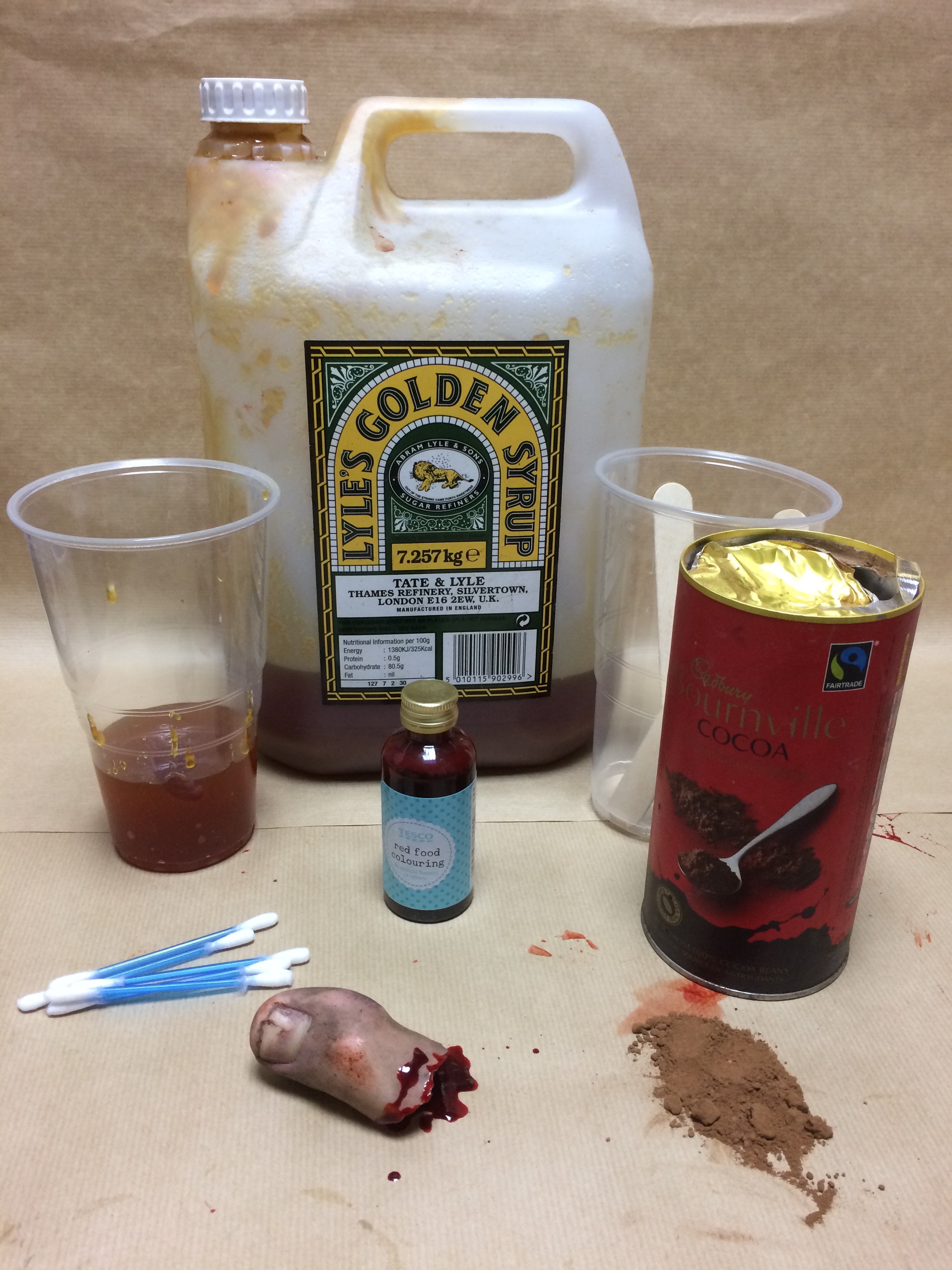 Gore effects can range massively in expense and complexity – often determined by budget. Sometimes a scene can require a full-body life-cast and several encapsulated silicone prosthetic appliances, and others can be as simple as rigging up a bit of tubing to pump blood for a quick slit throat scene. You can also make blood yourself at home with some golden syrup, food colouring and coffee (see details at the end). Incidentally, it’s also quite good on toast!