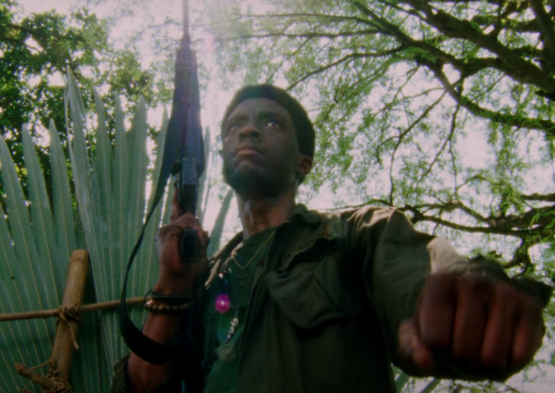 To set the situation, Lee uses the aspect ratio. The screen shrinks when we (crash)land in ‘Nam and we are introduced to Chadwick Boseman, who’s likely as eager as we are to make his mark outside of Marvel.