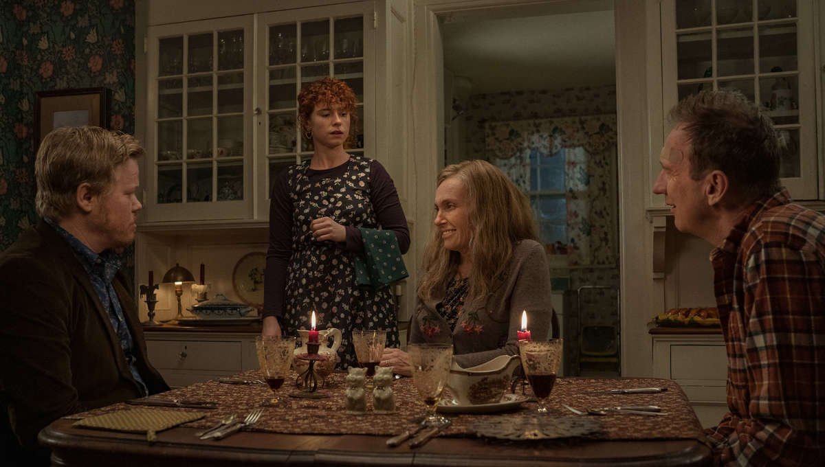 Im Thinking Of Ending Things. Jesse Plemons as Jake, Jessie Buckley as Young Woman, Toni Collette as Mother, David Thewlis as Father in Im Thinking Of Ending Things.