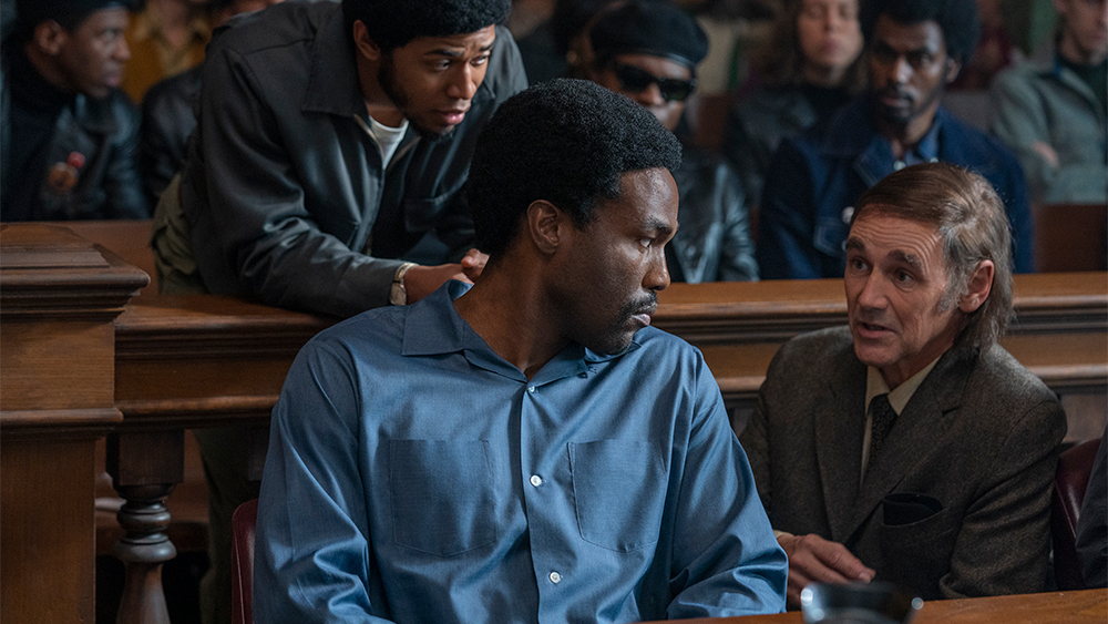 THE TRIAL OF THE CHICAGO 7 (L to R) KELVIN HARRISON JR. as Fred Hampton, YAHYA ABDUL-MATEEN II as Bobby Seale, MARK RYLANCE as William Kuntsler in THE TRIAL OF THE CHICAGO 7. Cr. NIKO TAVERNISE/NETFLIX © 2020