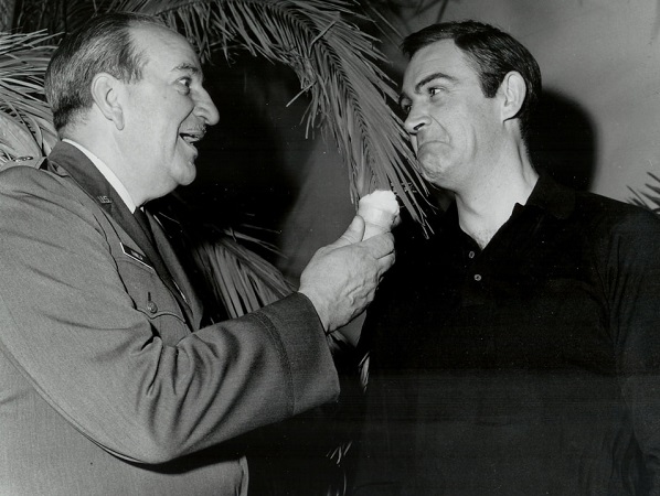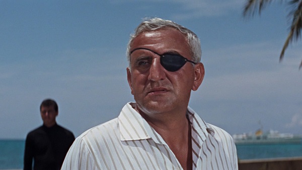The film starts with another fake death – something of a recurring feature of the Bond movies. This time it’s a French Major and SPECTRE agent. His transvestism allows for a good joke with Bond punching the widow in the face before a furniture fight worthy of The Prisoner of Zenda. Following this pre-credit sequence, we find Bond in a health farm recovering from his last assignment and fortuitously coming into contact with his next when another patient at the same clinic is embroiled in a plot to hijack a Vulcan bomber via a surgically constructed doppelganger and poison gas. There is an element of unnecessary complexity to the plot but in the end, a lead takes Bond to Nassau. There he meets up with yet another Felix Leiter – so far we’ve had three actors in the role: this time the deliciously named Rik Van Nutter – and Largo, along with Domino, the sister of the murdered pilot and played by Claudine Auger though again dubbed by Nikki van Der Syl who had also dubbed Ursula Andress. The Bond girls may look different but their voices are usually coming from the same mouth. A renowned Italian theater actor, Celi also was dubbed by Robert Rietti, who would go on to dub Tiger in You Only Live Twice. The Bond producers seemed unconcerned about having an actor who could give a complete performance. They wanted someone who could look a certain way – male or female – and then the rest they’d fix in post. Similarly, van Nutter got his part because he was a dining companion – along with his wife Anita Ekberg – with Cubby Broccoli. Bond productions were becoming a kind of club with a crew who would return again and again, an ensemble of actors, including voice actors, and writers and directors along with friends and acquaintances who could pop in and do a role.