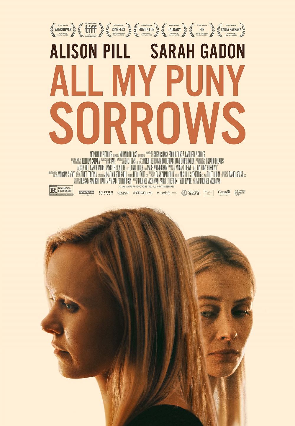 Based on Miriam Toews’ best-selling novel All My Puny Sorrows unexpectedly infuses wry humor into this heart-wrenching story of two loving sisters: one a gifted pianist (Sarah Gadon) obsessed with ending her life the other a struggling writer (Alison Pill) who in wrestling with this decision, makes profound discoveries about herself.