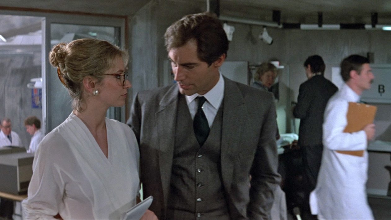 This anticipates the more serious direction Daniel Craig’s more recent entries will take the series but one sign of unfortunate continuity comes with John Glen’s direction. Glen had been an editor and second unit director before getting the nod to take over. He directed all the Bond films of the 1980s and for the most part stuck to a template that involved interlacing the action with comedy and reaction shots. Even here with a noticeable change in tone, he can’t resist some monkeys in the Gibraltar sequence and a Parakeet returning from For Your Eyes Only. These remnants of Moore persist also in the Q scenes which belong to a familiar tradition that appears to be irrelevant to the plot, though at least now we have a new Moneypenny.