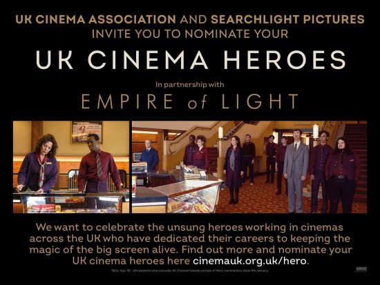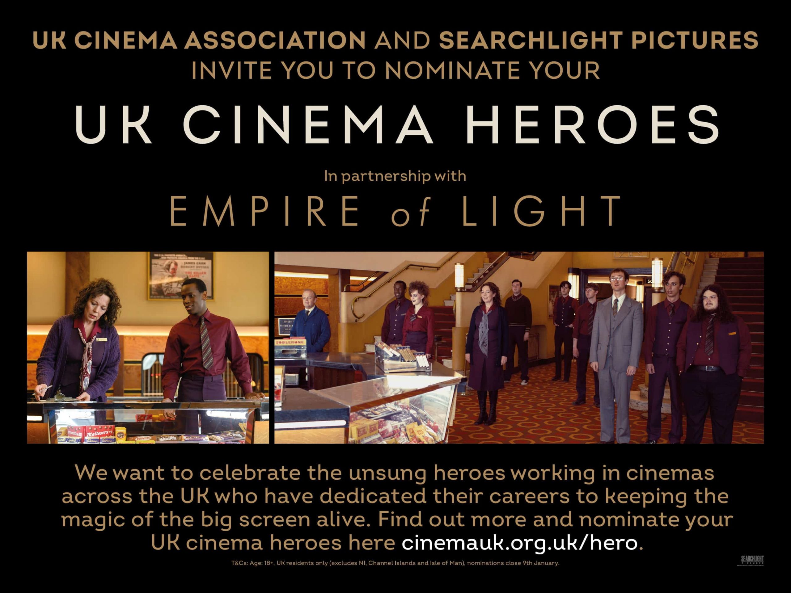 To celebrate the UK release of Empire of Light on January 9th, Searchlight Pictures has partnered with the UK Cinema Association (UKCA) to launch a nationwide competition to celebrate the UK’s ‘Cinema Heroes’ – those who have dedicated their careers to keeping the magic of the big screen alive for communities throughout the country. From the box office, projection, managers, to anyone who has helped keep the cinema flame alight.