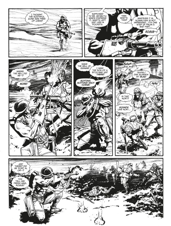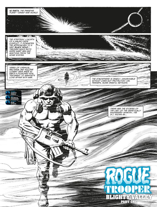 Tuesday 29th September marks the anniversary of Rogue Trooper’s debut in the pages of 2000 AD, and to celebrate Rebellion has sent over the cover and some pages from the forthcoming collection of Rogue’s recent return to 2000 AD in Rogue Trooper: Blighty Valley by Garth Ennis and Patrick Goddard.