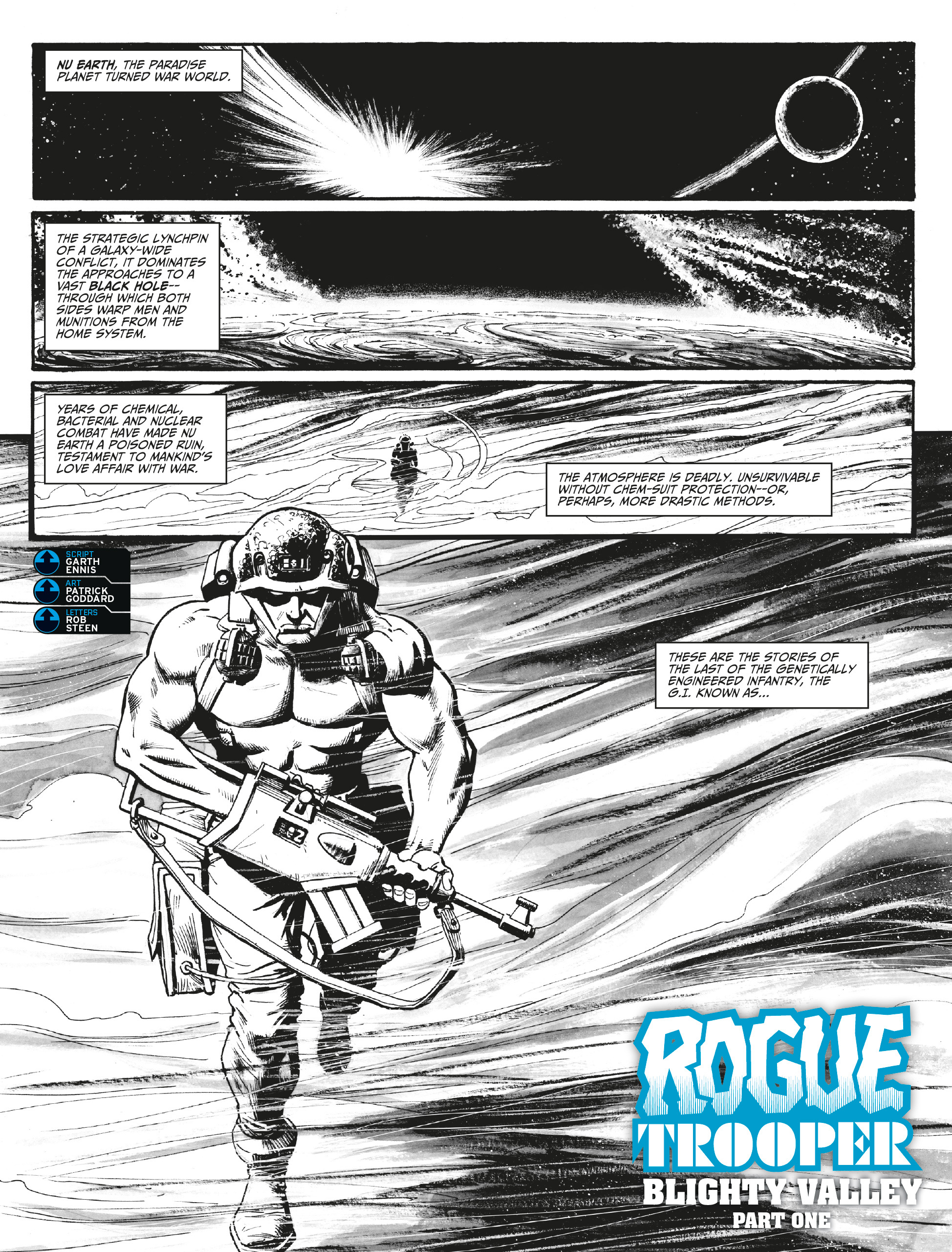 Matt Smith, editor of 2000 AD said ‘Garth Ennis has written classic 2000 AD characters before, but this is the first time he’s scripted Rogue Trooper. As you’d expect from someone steeped in war comics, his take on the G.I. is powerful, thrilling and explosive. With Patrick Goddard providing the stunning visuals, this a dramatic, unmissable addition to the Nu Earth saga.’