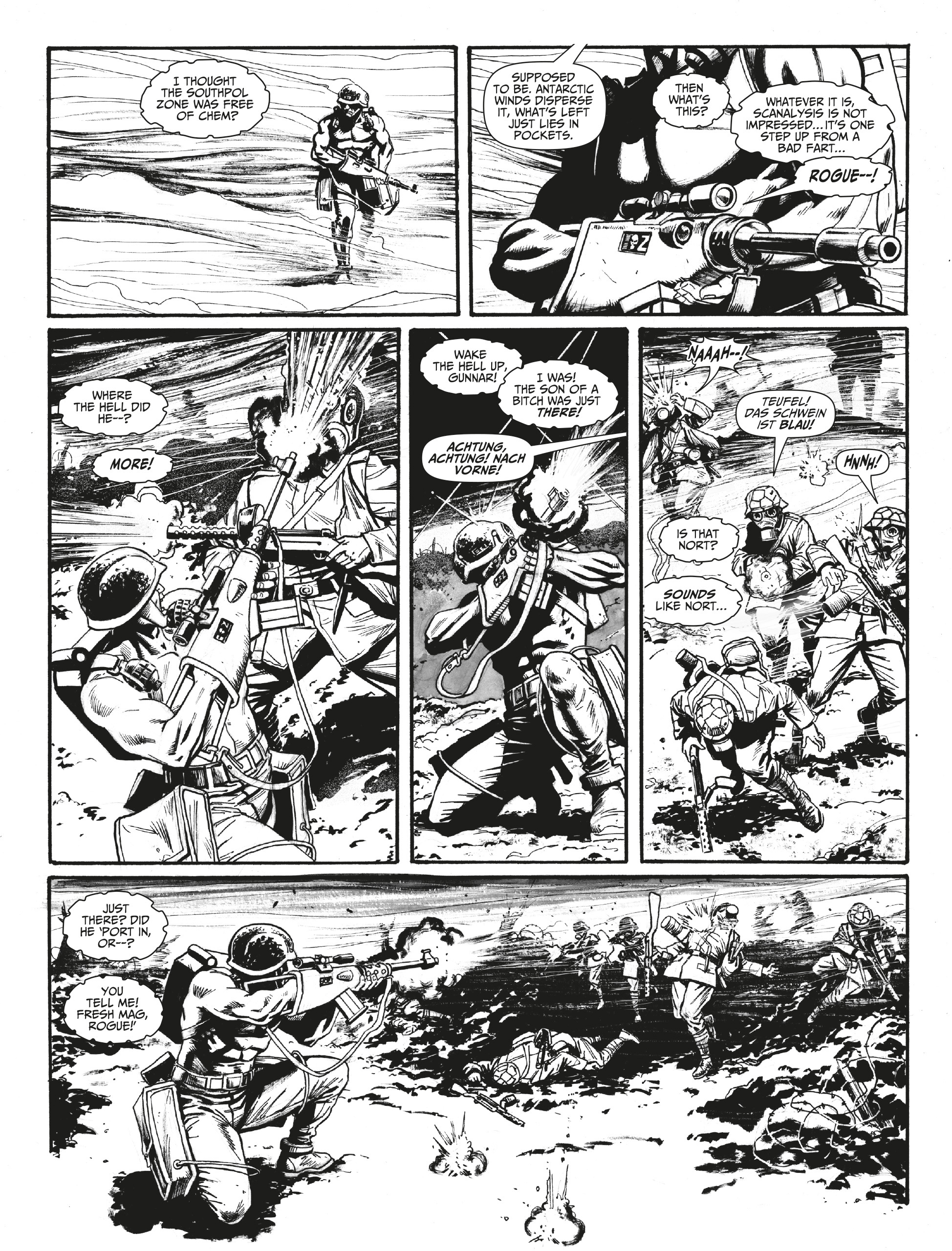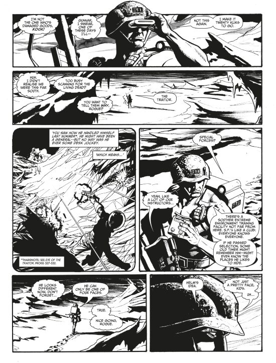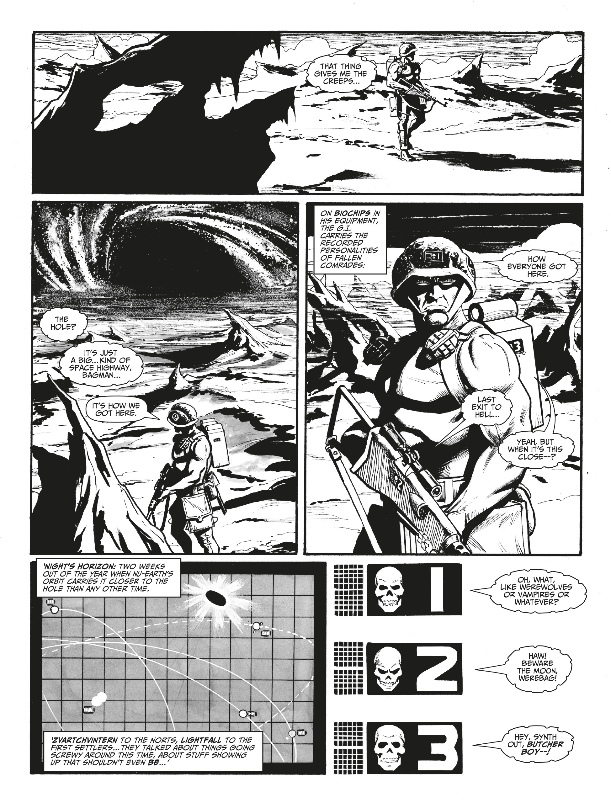 Blighty Valley is Rogue’s first regular appearance in 2000 AD in a number of years – a thirteen-part story set at ‘Night’s Horizon’, the annual event where Nu Earth’s orbit carries it closest to a nearby black hole. The Norts call it Zvartchvintern; the first settlers knew it as Lightfall. Things have a reputation for going a little… screwy around this time. Now, Rogue and his bio-chip buddies are about to experience those effects first-hand…