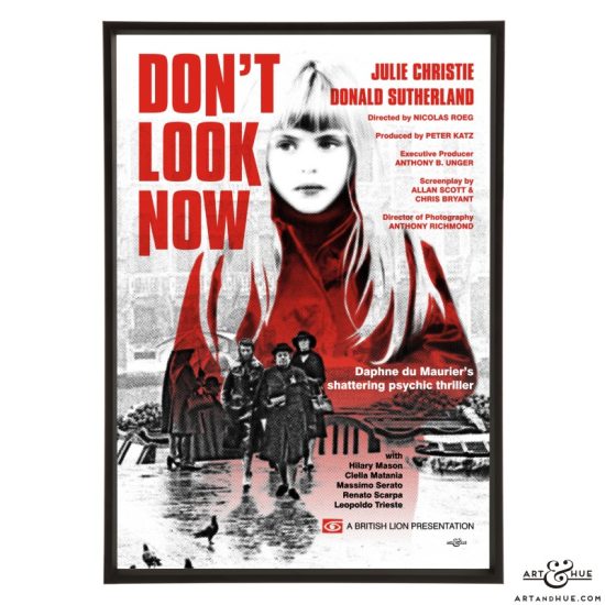 To mark 50 years since the film’s release, Art & Hue has re-imagined the poster for Nicolas Roeg’s classic British horror thriller Don’t Look Now starring Donald Sutherland & Julie Christie, available in three sizes and many colour options.