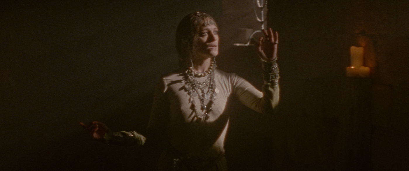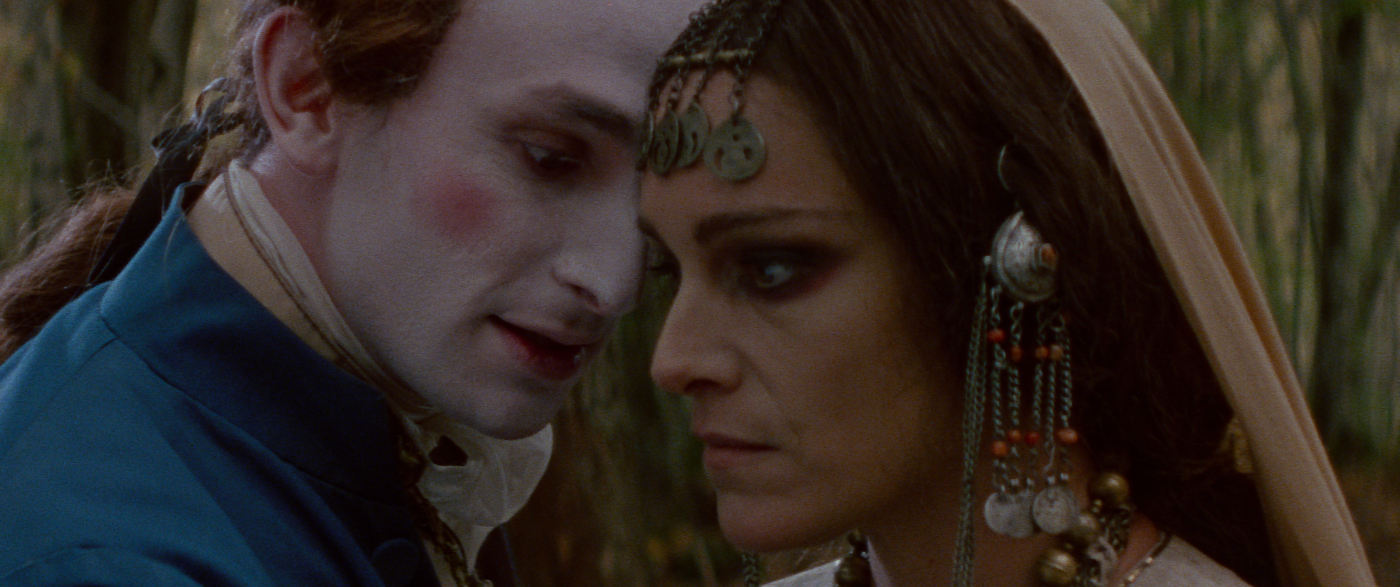 It’s the traditional dark and stormy night, as the foppish Marquis Jacques Antoine Saturnin d’Urfé, an aristocratic envoy of the king of France (complete with powdered wig and painted face) batters on a formidable door, seeking aid. His escort has been slaughtered by bandits, his baggage and horses stolen. The man within only peers out through a slatted grille – he informs the Marquis that he opens this door for no-one after dark (shades of classic Hammer films, the villagers locked up at night, terrified), but he does at least advise him to travel on (without stopping) through the night to the home of the venerable Gorcha, who will assist him.
