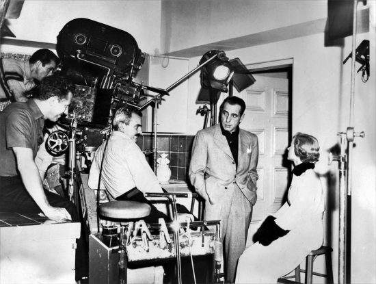 2D8YJRM NICHOLAS RAY Cinematographer BURNETT GUFFEY HUMPHREY BOGART and GLORIA GRAHAME on set candid during filming of IN A LONELY PLACE 1950 director NICHOLAS RAY story Dorothy B. Hughes Santana Pictures Corporation / Columbia Pictures