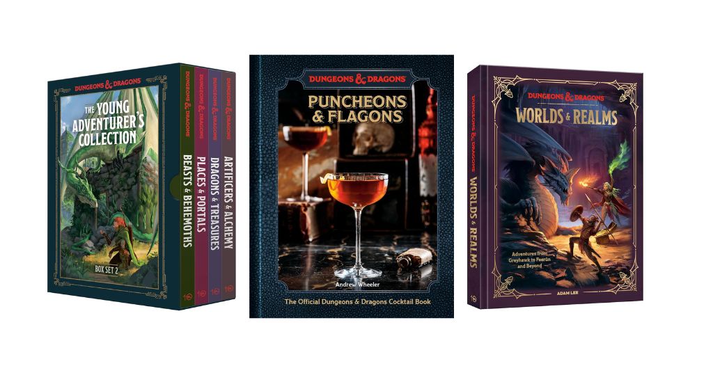 Ten Speed Graphics has three new Dungeons & Dragons-themed books out on shelves now, and digging into each one of them, I can say that there isn’t a loser in the bunch. First up is Dungeons & Dragons: Worlds & Realms. This massive hardcover book serves as a combination of art/history book and fictional narrative. Readers are taken through a history of some of D&D’s most well-loved worlds and realms, but rather than just being a reference book, it’s told as a narrative history by the mage MordenKainan, who infuses some serious storytelling into the proceedings. His lessons are accompanied by artwork from gamebooks and modules of the past 50 years, giving historical artwork a gallery to view as well. As a bonus the book also includes exclusive short stories by award-winning contributors Jaleigh Johnson, Jody Houser and Eric Campbell, Jasmine Bhullar, and Geoffrey Golden. The second release is the Young Adventurers Collection: Box Set 2. This four-book box set includes individual reference books geared for younger D&D players – although a lot of fully adult players will probably enjoy them as well. Each book offers up write-ups and breakdowns of various creatures, realms, objects, and more… everything you need to make your way through a D&D adventure. The books are smaller, kind of digest-sized, but they are also filled with both a ton of information in text form as well as lavishly painted illustrations. The four books are: Beasts & Behemoths, which focuses on monsters of all kinds; Dragons & Treasures obviously focuses on the variety of dragons in the D&D world as well as their treasures. Places & Portals focuses on the lands and landmarks of the D&D world; and finally, Artificers & Alchemy focuses on artifacts, objects, magic creatures, and more. The third release is probably the least lore-heavy release of the three but it might just be the most fun: Puncheons & Flagons is an officially-licensed cocktail recipe book that’s themed around the D&D world. This gorgeous book is filled with cocktail recipes that have creative, D&D-inspired names (such as The Emerald Door and the Total Party Katastrophe). Each recipe includes a historical in-game text section that explains how the drink fits into the world of D&D, then it gives you the recipe itself as well as a history of the drink. There are beautiful photos for each cocktail, all decked out to look like they were taken in a fantasy world. There are also a few D&D illustrations mixed in with the text as well. The book is exceptionally well-designed, and anyone who wants to add drinks to their next D&D game night will easily impress their friends with a sampling of these drinks: All three of these books are outstanding reference and reading for fans of Roleplaying games and Dungeons & dragons in particular. Make yourself a new cocktail and curl up with one of these great books as son as you can!