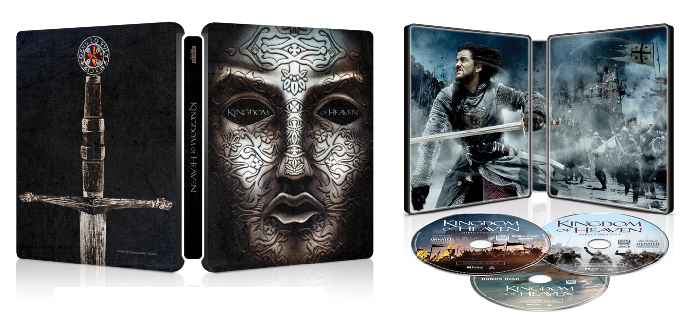 The 20th Anniversary release of Kingdom of Heaven is a three-disc set encased in a collectible SteelBook® that honours the remarkable weaponry and masks featured in the film. Behind the scenes footage includes a look at the creation of spectacular visual effects, a retrospective of world premiere excitement, deleted scenes and insightful filmmaker reflections so that fans can appreciate and remember it as the brave and beautiful film Ridley Scott intended it to be.