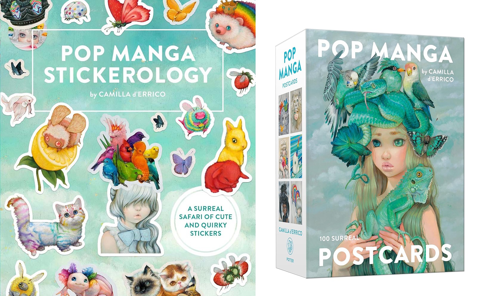There are two new products out this week based on the pop manga artwork of Camille d’Errico: Pop Manga Stickerology and Pop Manga Postcards. D’Errico has made a name for herself in the comic book and pop culture worlds by developing a style called “pop manga,” which is sort of a mash-up of the Japanese manga style (obviously) and the “big eyes” paintings by Margaret Keane. They’re colorful, flowery, soft images, and they’ve really developed a fan following. Clarkson Potter has two new products for fans of d’Errico’s work.