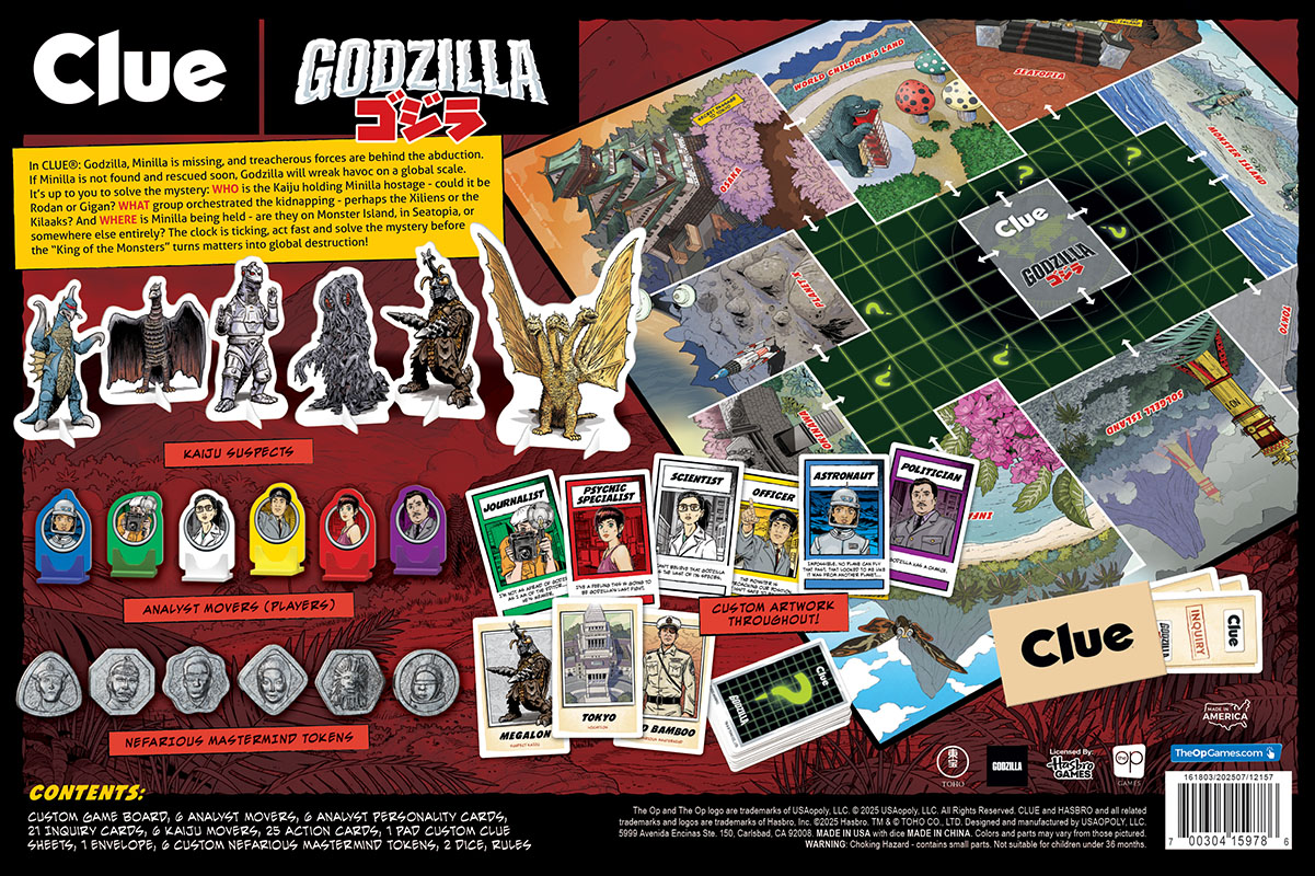 Get ready for an earth-shaking monster mystery game when CLUE®: Godzilla hits retailers on September 24, 2025, from Toho International in partnership with The Op Games. CLUE®: Godzilla challenges players to outwit Godzilla in a race to save the world! In this iconic crossover, Minilla has gone missing, and it’s up to you to find Godzilla’s son and solve the ultimate kaiju mystery before the “King of Monsters” unleashes global destruction.